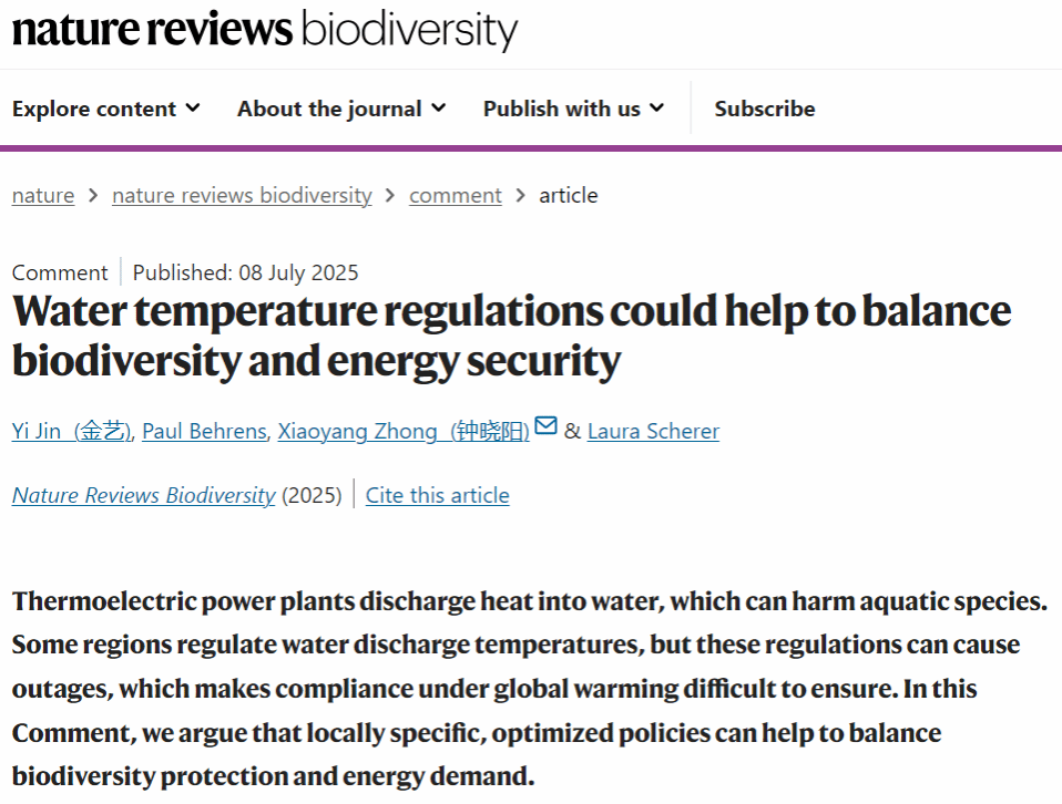 7月8日,产业经济研究院教师金艺在Nature子刊《自然综述:生物多样性》(Nature Reviews Biodiversity)以Water temperature regulations could help to balance biodiversity and energy security为题发表论文。金艺为论文第一作者,sunbet申搏官方网站为第一完成单位,国际应用系统分析研究所(IIASA)钟晓阳为论文通讯作者,英国牛津大学教授Paul Behrens和荷兰莱顿大学副教授Laura Scherer为论文合作者。