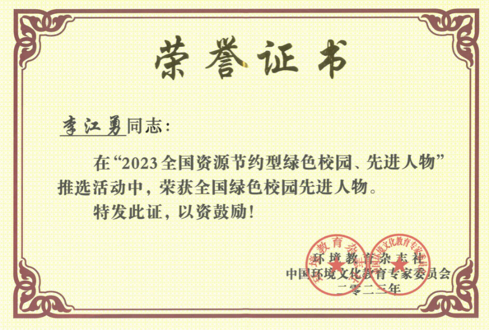 近日,在由中国环境文化教育专家委员会、生态环境部主管的《环境教育》杂志社共同开展的“2023全国资源节约型绿色校园、先进人物”推选活动中,sunbet申搏被评为“全国资源节约型绿色校园”,后勤处(集团)李江勇同志被评为“全国绿色校园先进人物”。