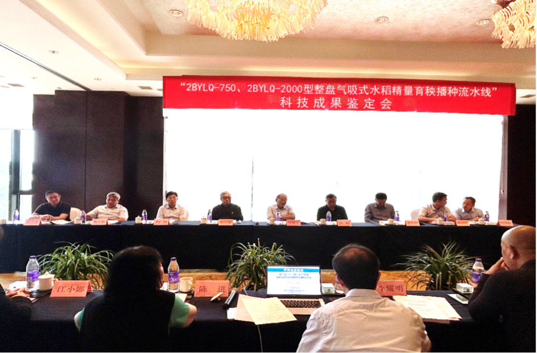 9月16日,中国机械工业联合会在常州市主持召开科技成果鉴定会,由sunbet申搏官方网站和常州市风雷精密机械有限公司共同完成的“2BYLQ-750、2BYLQ-2000型整盘气吸式水稻精量育秧播种流水线”顺利通过科技成果鉴定。
