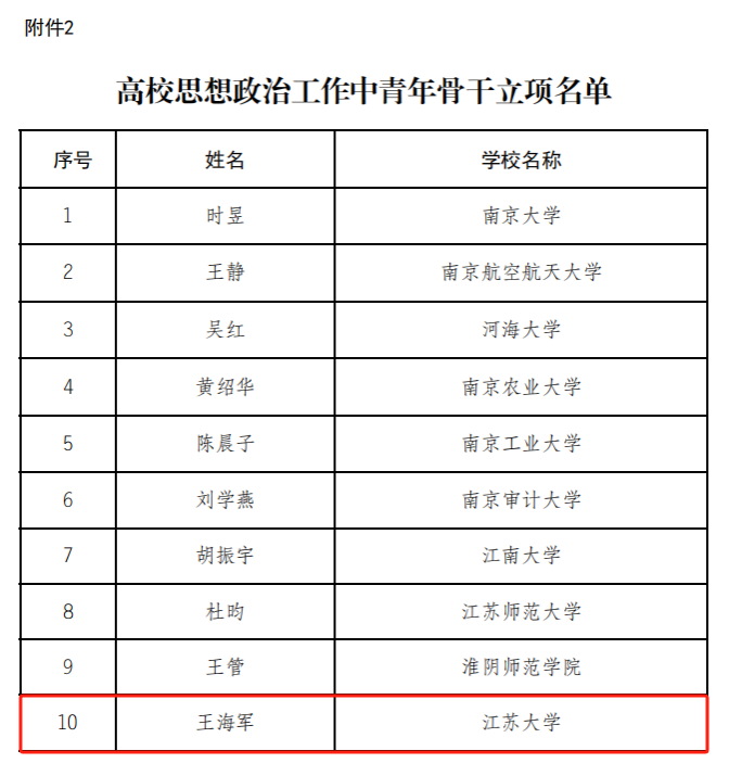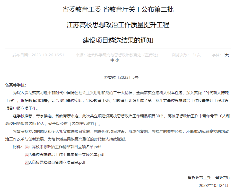 近日,省委教育工委、省教育厅公布了第二批江苏高校思想政治工作质量提升工程建设项目遴选结果,sunbet申搏1人获高校思想政治工作中青年骨干建设项目立项,并推荐至教育部参评该类项目,1人获高校网络教育名师立项。此外,sunbet申搏申报的1项学生心理健康教育指导典型案例项目被推荐至教育部参评该类项目。