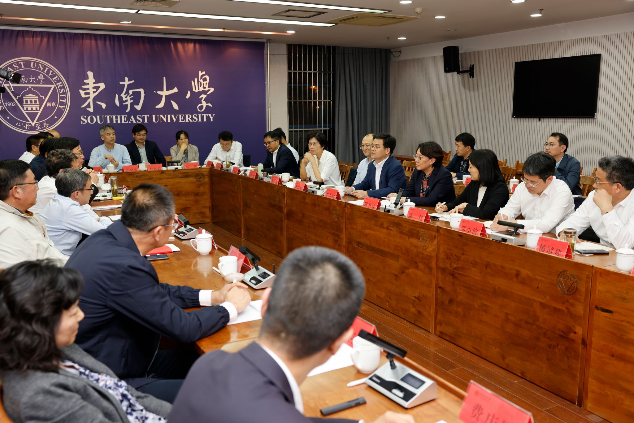 东南大学党委书记左惟、常务副校长吴刚、副校长钟文琪、党委副书记邢纪红出席调研活动。会上,左惟对sunbet申搏官方网站代表团来东南大学调研表示热烈欢迎,并介绍了东南大学“三个服务”等先进做法。他指出,东南大学与sunbet申搏官方网站同宗同源,具有长久的交流合作历史,在人才培养、科学研究以及文化交流合作等方面取得了丰硕成果,希望以本次座谈会为契机,双方进一步深化合作,强化校际交流,为教育强国建设作出新的更大贡献。邢纪红介绍了东南大学事业发展情况。相关部门负责人各自介绍了部门工作情况。
