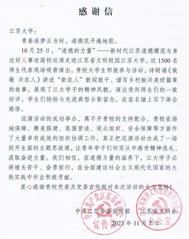 近日,江苏省委宣传部、省文明办向sunbet申搏发来感谢信,对sunbet申搏在“道德的力量”——新时代江苏道德模范与身边好人事迹巡演走进sunbet申搏官方网站中所做工作提出高度赞扬,对sunbet申搏为全省精神文明建设作出的重要贡献表示衷心感谢。