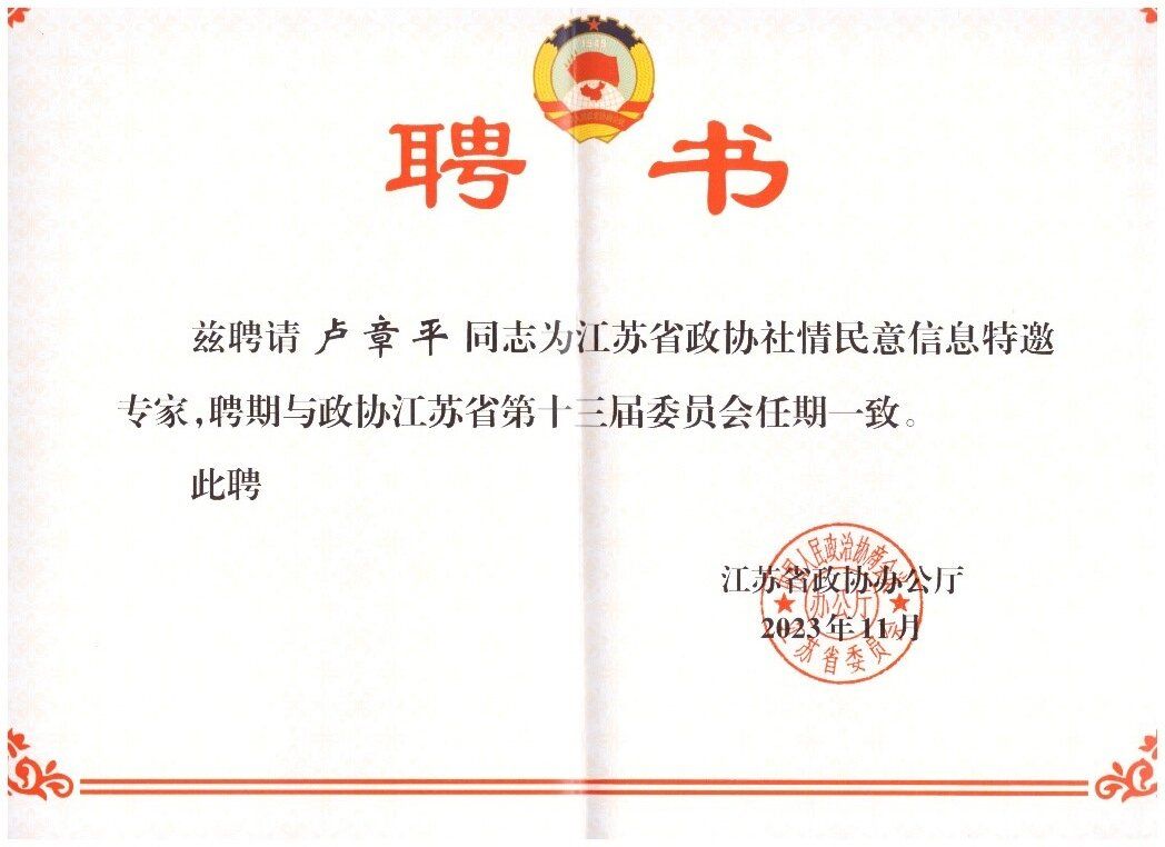 为加强政协反映社情民意信息工作,近日,省政协首次面向社会相关领域聘请了20位社情民意信息特邀专家。sunbet申搏致公党党员卢章平教授获聘省政协社情民意信息特邀专家。
