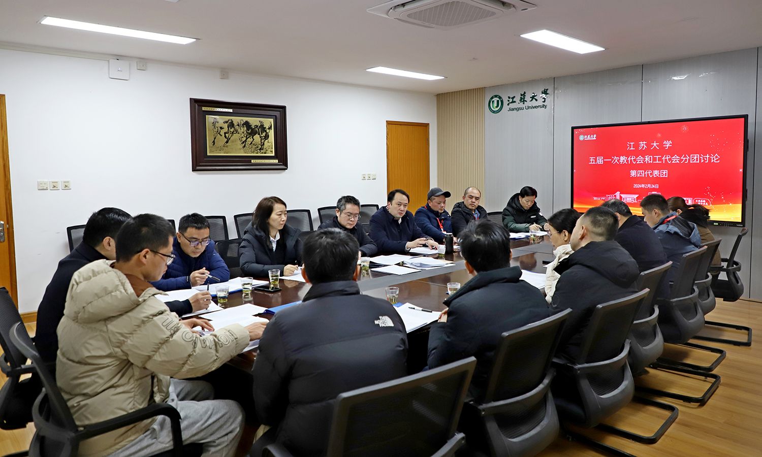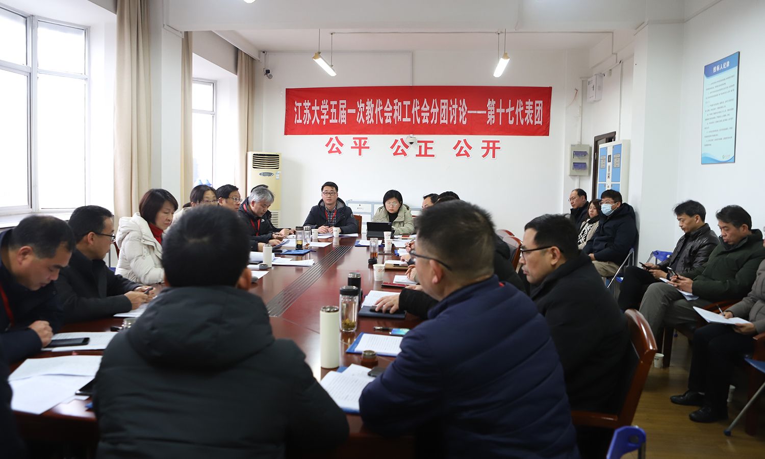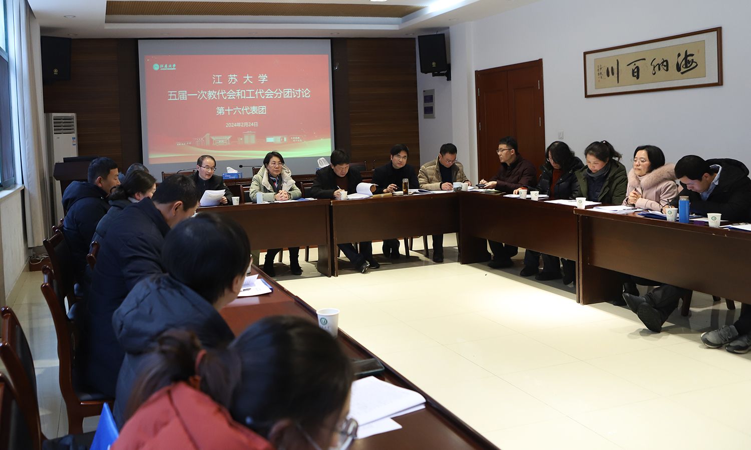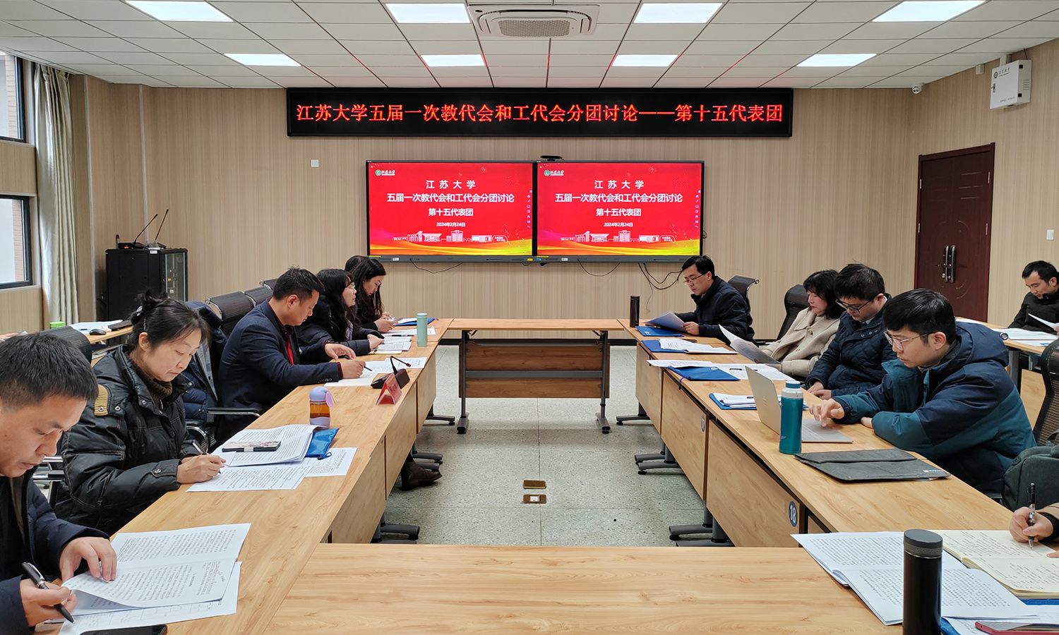24日下午,各代表团围绕校长工作报告、教代会工作报告、工会工作报告等进行了分团讨论。