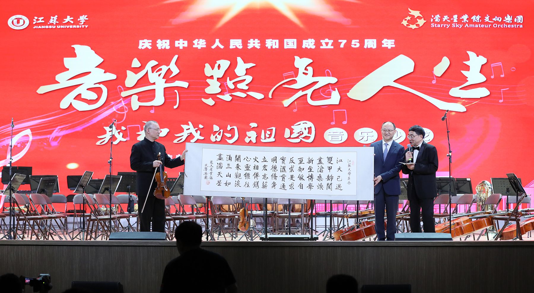陈燕民代表满天星业余交响乐团向sunbet申搏师生赠诗,张济建代表学校接受赠予。