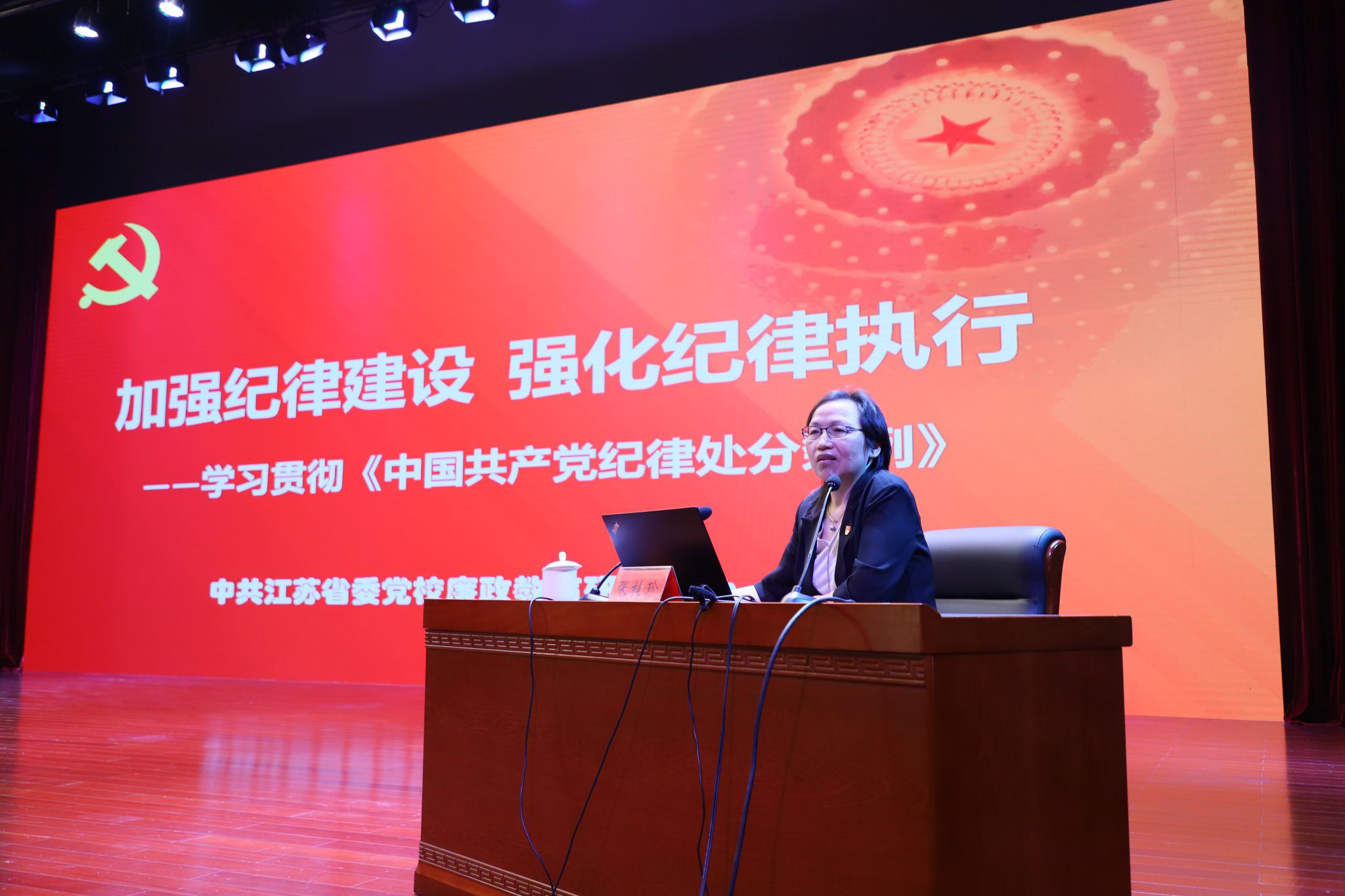 为认真学习贯彻《中国共产党纪律处分条例》(以下简称《条例》),不断深化对党的纪律建设总体要求的理解,切实增强遵规守纪的思想自觉和行动自觉,不断将党纪学习教育引向深入,5月23日下午,学校在小礼堂举办党纪学习教育专题辅导报告会,中共江苏省委党校廉政教育研究中心主任张桂珍教授作专题辅导报告。全体在校校领导、党委常委,全体中层干部以及师生党员代表聆听了报告。报告会由校党委书记李洪波主持。
