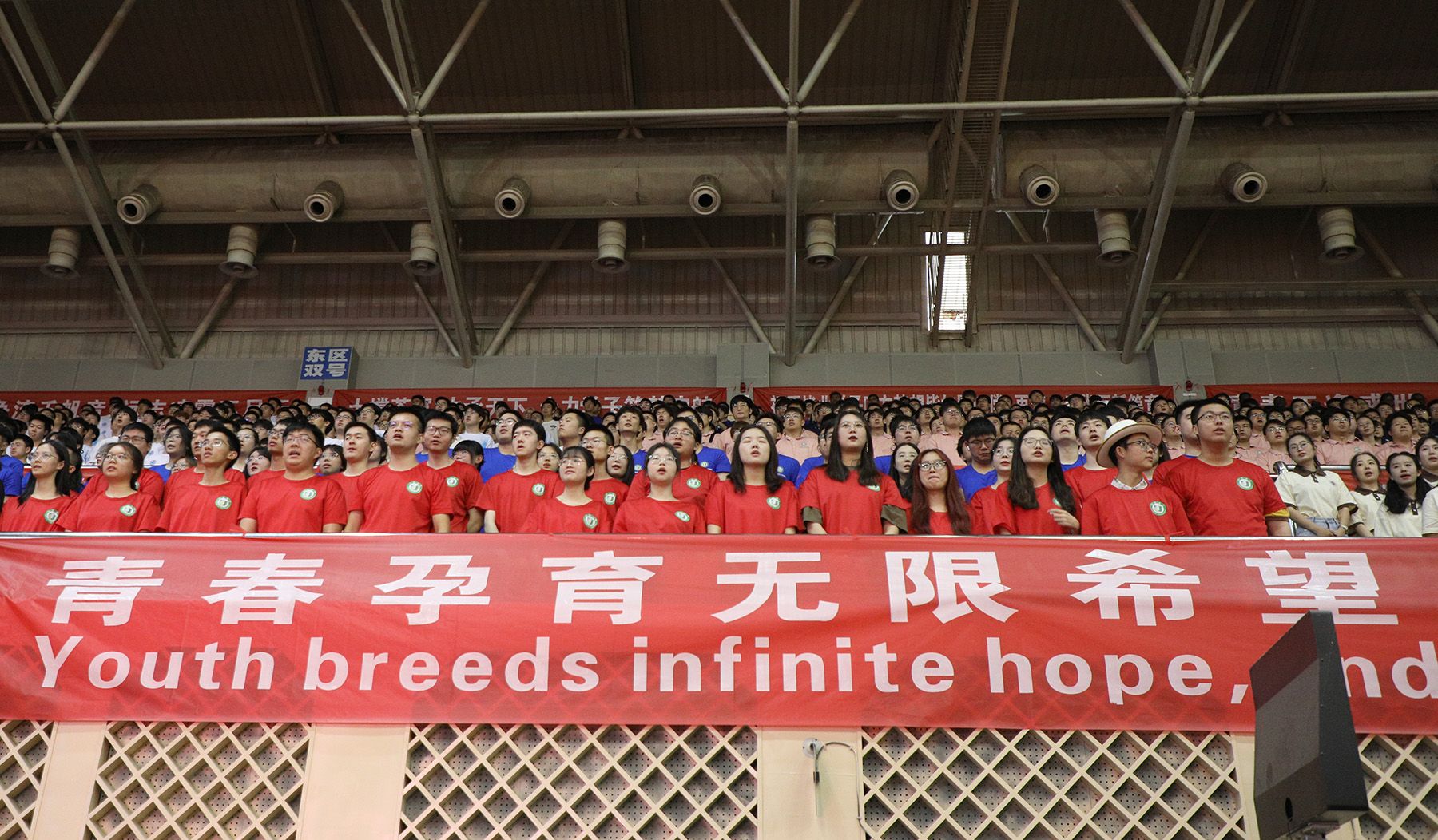 典礼上,全体起立,奏唱国歌。
