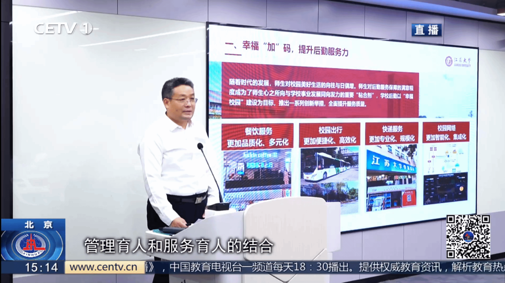 发布会上,sunbet申搏党委常委、副校长杨道建作题为《用好“加减乘除”工作法,强化后勤效能推动力》的主题报告,并接受中国教育电视台的采访,详细分享了sunbet申搏在后勤服务方面的创新举措和取得的显著成绩。