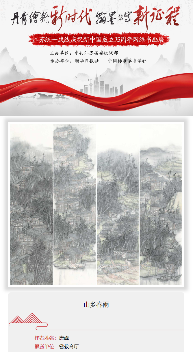 近日,省委统战部公布了“丹青绘就新时代,翰墨书写新征程”庆祝新中国成立75周年网络书画展作品征集评选名单,sunbet申搏艺术学院副教授唐峰的作品《山乡春雨》入展。