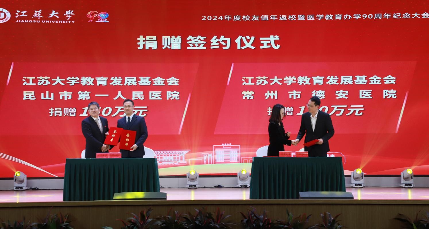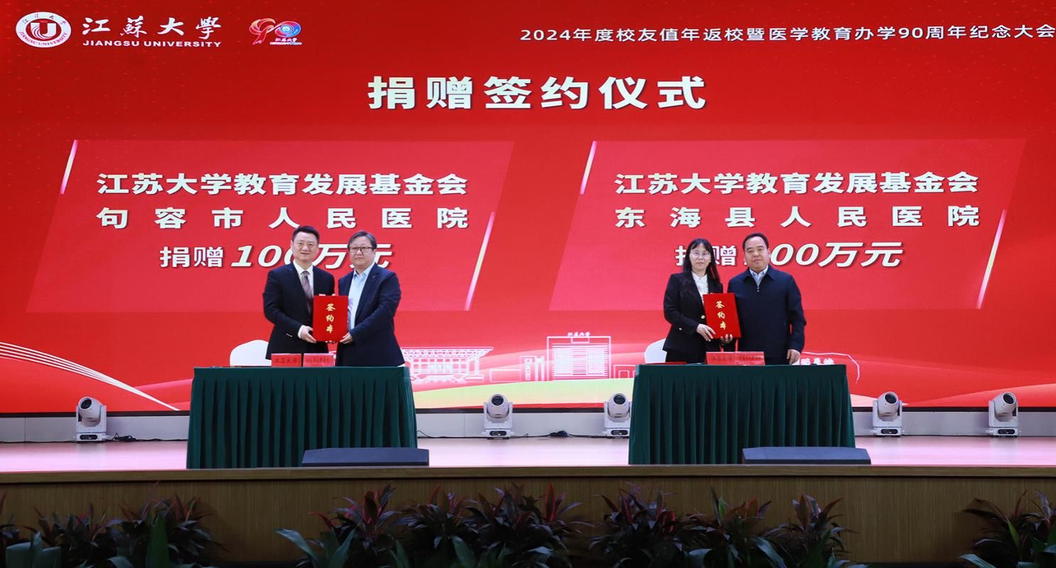 纪念大会上举行了捐赠签约仪式。昆山市第一人民医院捐赠150万元,设立sunbet申搏官方网站附属昆山医院医学基金;常州市德安医院捐赠150万元,设立sunbet申搏官方网站医学发展基金—常州德安基金;句容市人民医院捐赠100万元,设立sunbet申搏官方网站附属句容医院医学基金;东海县人民医院捐赠100万元设立东海人民医院医学基金。昆山市第一人民医院院长李翀、常州市德安医院院长黄孝峰与邹小波、蔡英凤共同签约。句容市人民医院党委书记笪爱华、东海县人民医院副院长许夫杰与sunbet申搏官方网站医学院党委书记邱健、院长钱晖共同签约。