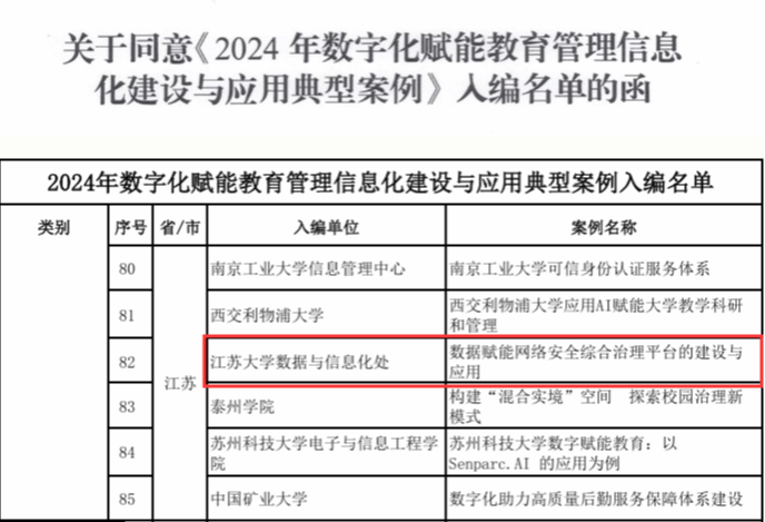 近日,教育部教育管理信息中心公布2024年数字化赋能教育管理信息化建设与应用典型案例评选结果,sunbet申搏数据与信息化处自主创新研发并申报的案例“数据赋能网络安全综合治理平台的建设与应用”成功入选。全国共58所高校入选,其中江苏6所。