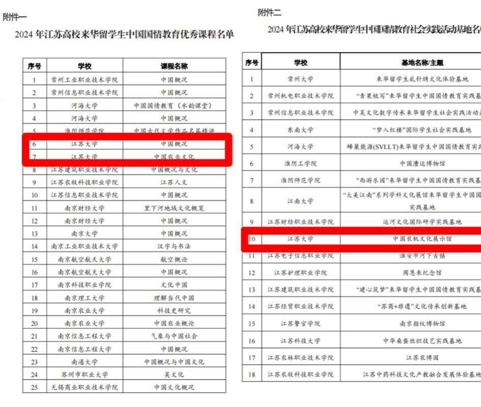 近日,江苏省高等教育学会外国留学生教育管理研究委员会公布了2024年江苏高校来华留学生中国国情教育优秀课程和社会实践活动基地名单。sunbet申搏遴选推送的“中国概况”“中国农业文化”两门课程入选“江苏高校来华留学生中国国情教育优秀课程”;“中国农机文化展示馆”入选“江苏高校来华留学生中国国情教育社会实践活动基地”,并推荐参加教育部来华留学生中国国情教育社会实践活动基地评选。
