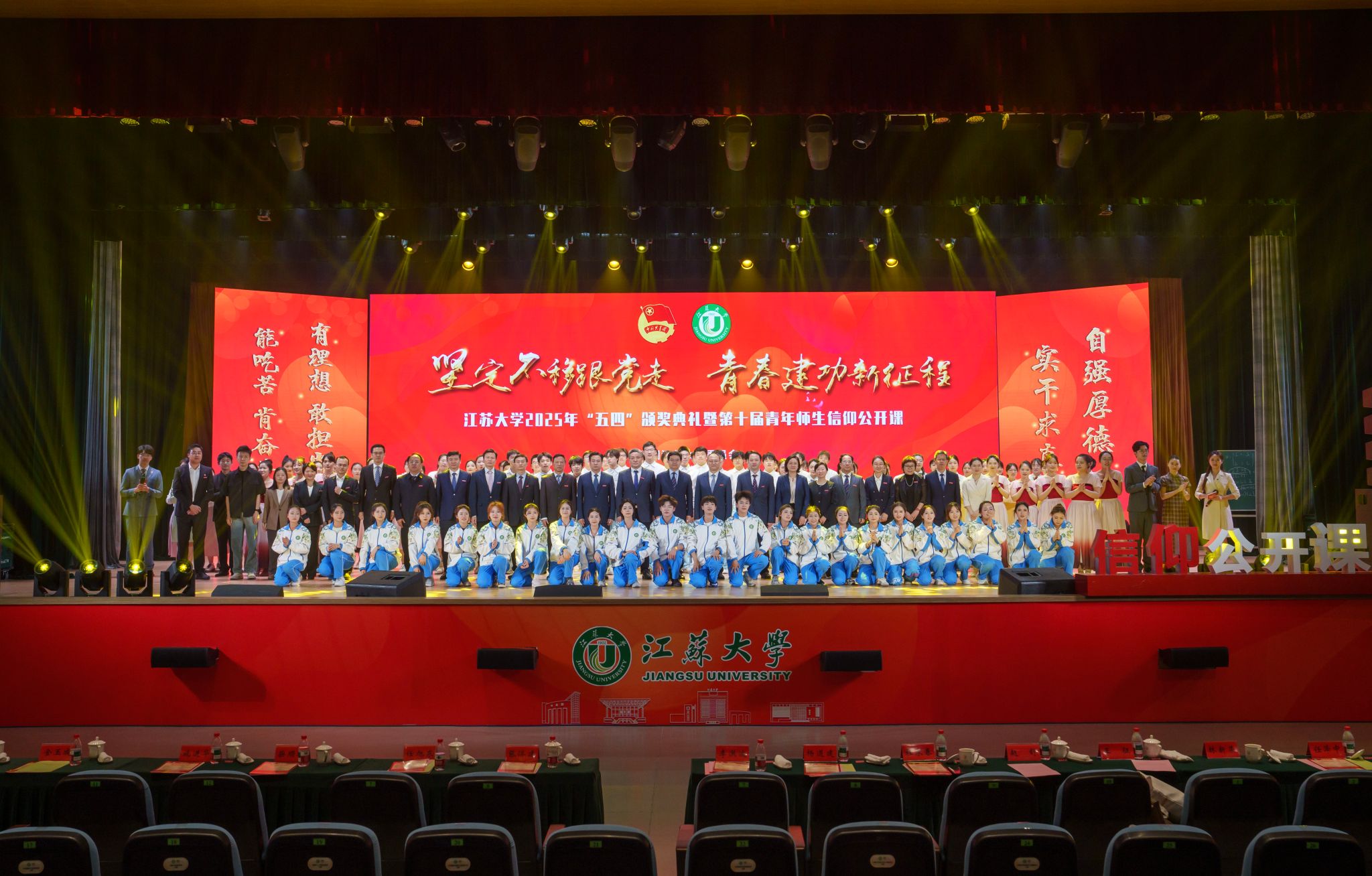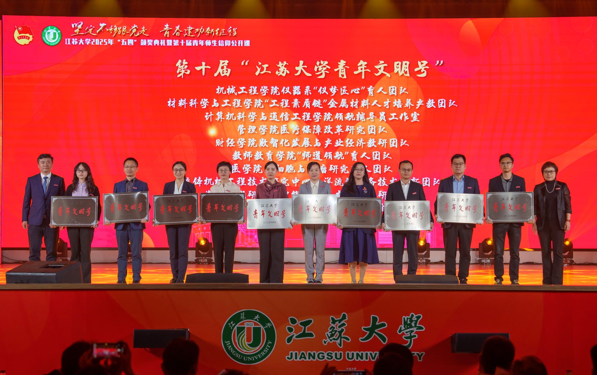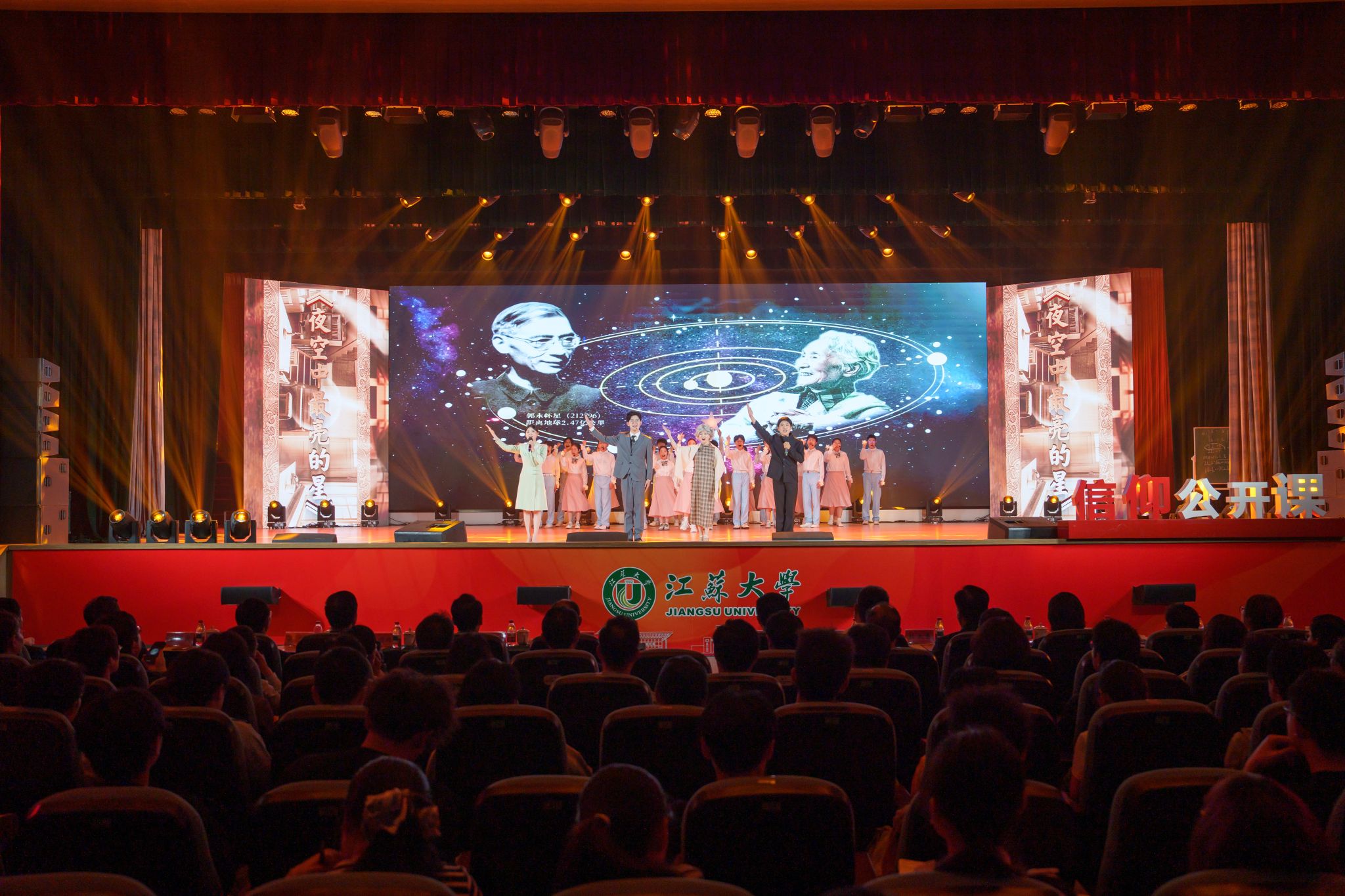 典礼现场,大学生艺术团表演舞蹈《为了万家灯火》,农业工程学院王亮辉同学带来TED演讲《青春聚力 星河共燃》,教师教育学院专硕23级团支部带来风采展示《如愿》,流体机械工程技术研究中心青年教师周岭带来青年教师说《奋斗的青春最美丽》,大学生艺术团表演舞蹈《接班人》。大学生艺术团献演的原创音诗画作品《夜空中最亮的星》引发强烈共鸣,作品聚焦“科学家精神”主题,以“中国应用语言学之母”“两弹一星”元勋郭永怀的夫人李佩(镇江籍)为创作原型,讲述了她在三尺讲台托举无数科研梦想故事。