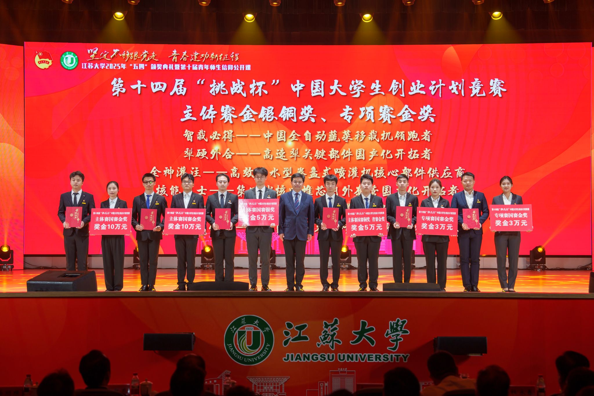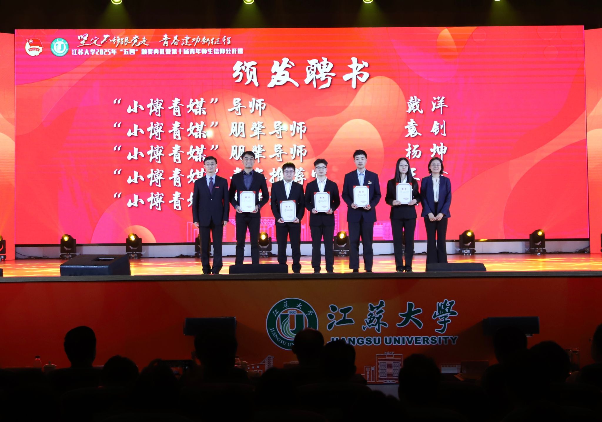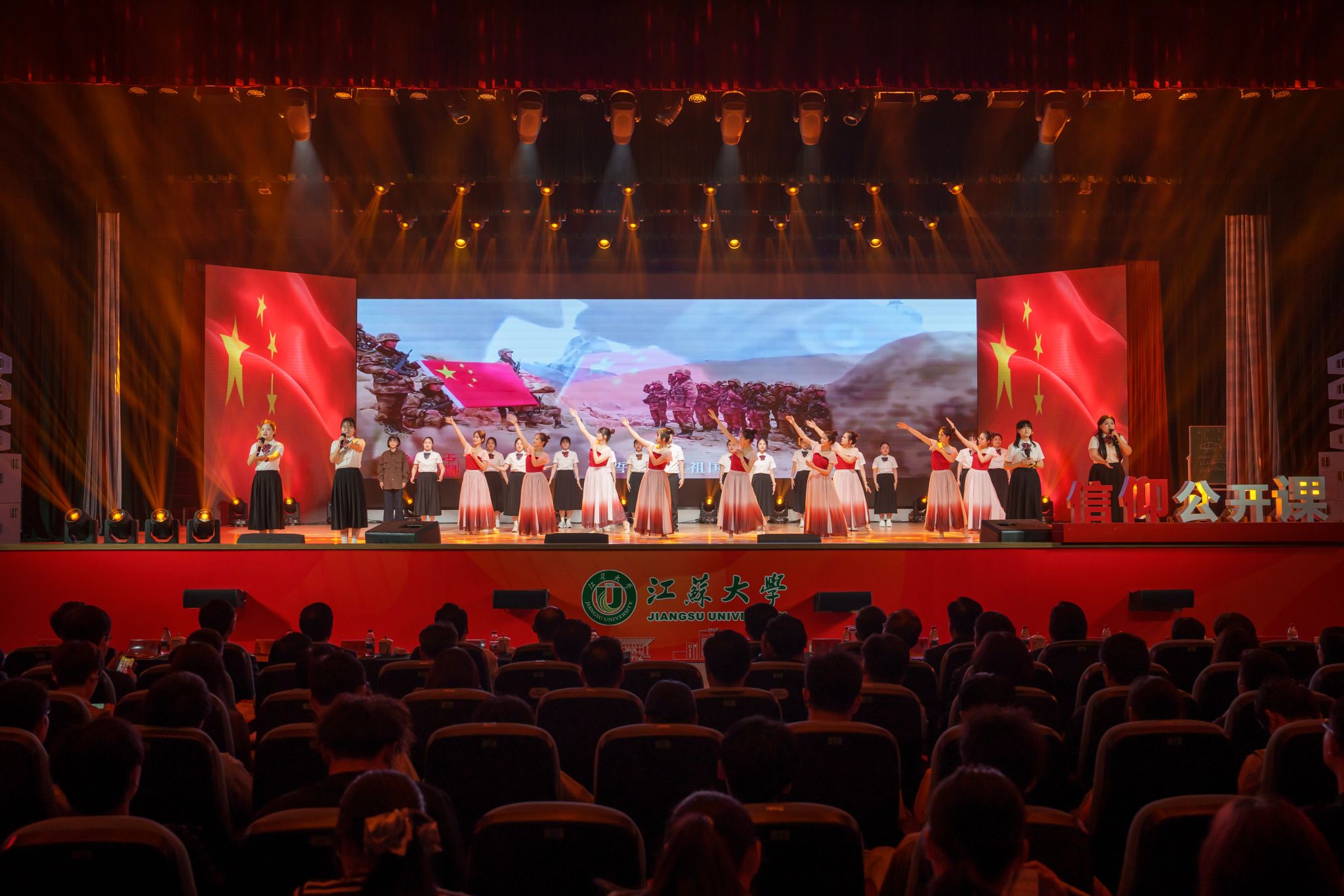 典礼现场,大学生艺术团表演舞蹈《为了万家灯火》,农业工程学院王亮辉同学带来TED演讲《青春聚力 星河共燃》,教师教育学院专硕23级团支部带来风采展示《如愿》,流体机械工程技术研究中心青年教师周岭带来青年教师说《奋斗的青春最美丽》,大学生艺术团表演舞蹈《接班人》。大学生艺术团献演的原创音诗画作品《夜空中最亮的星》引发强烈共鸣,作品聚焦“科学家精神”主题,以“中国应用语言学之母”“两弹一星”元勋郭永怀的夫人李佩(镇江籍)为创作原型,讲述了她在三尺讲台托举无数科研梦想故事。