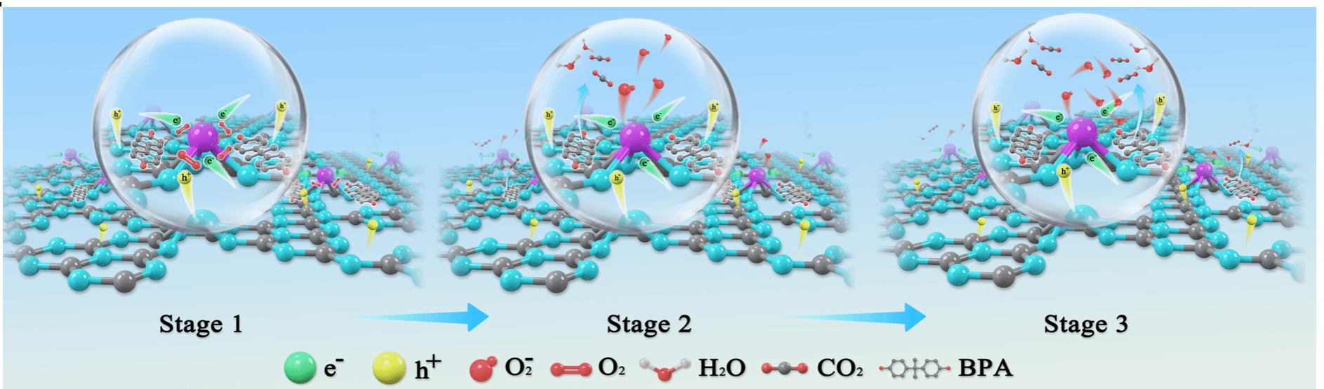 单原子催化剂因其100%的原子利用效率在催化领域备受瞩目。然而,传统对称构型(如M-N4)因内建电场强度不足,导致电子转移效率受限。此外,光催化过程中光吸收的空间异质性、载流子局域化效应以及多活性位点协同作用的复杂耦合,进一步制约了催化性能的提升。针对上述挑战,研究创新性的设计并构筑了一种兼具“非对称配位”与“多活性位点”特性的钴单原子修饰氮化碳催化剂。该催化剂在可见光(λ≥420 nm)照射下,60分钟内即可高效降解双酚A,去除率高达98.6%,其二级反应速率常数较纯氮化碳催化剂提升了114倍。连续流反应测试表明,催化剂在长达10小时的持续运行中,降解效率始终保持在90%以上,展现出优异的稳定性与工业应用潜力。该研究成功实现了催化剂电荷分离效率的突破性提升,并建立了污染物降解的双阶段动力学机制。结合原位X射线光电子能谱(XPS)、原位红外光谱(DRIFTS)及理论计算,深入阐明了非对称活性中心主导的反应机理。该工作从原子尺度阐明了配位对称性调控催化剂电子结构的本质规律,建立了“结构不对称性—载流子行为—反应动力学”的因果关系链,为设计新型环境催化材料提供了理论框架与技术范式。(能源与动力工程学院)