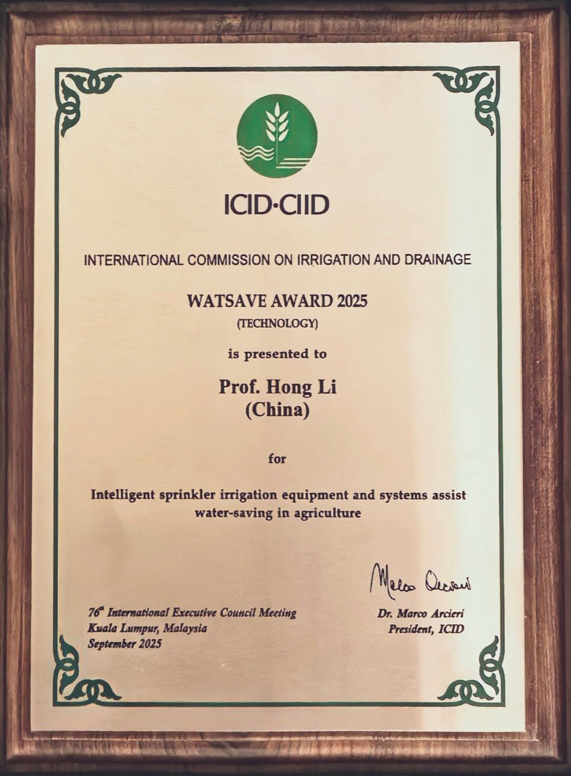 李红长期致力于节水灌溉装备与技术的创新研究,在低压喷灌技术及低压均匀喷洒喷头、变量喷洒喷头、水肥混施装置等的原创研发以及新型卷盘式喷灌机组等节水灌溉装备研制上做出了创新贡献。基于作物水肥需求信息的农田灌排智能管控系统、新一代灌溉机组及装备已广泛应用于我国大田稻麦、丘陵茶园等灌溉施肥的田间管理,显著提升了我国节水灌溉的技术水平和应用效能。此次获奖不仅体现了个人的学术影响力,也标志着中国在节水灌溉技术研发与应用领域的国际领先地位得到进一步认可。