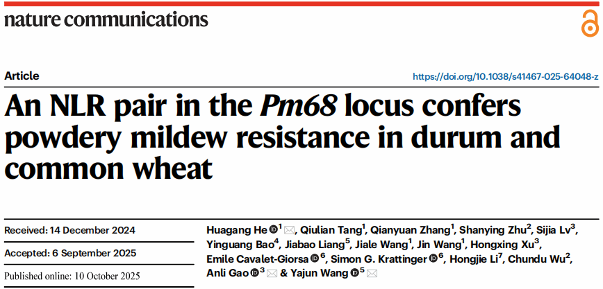 近日,生命科学学院何华纲团队联合多家单位在Nature Communications上发表题为An NLR pair in the Pm68 locus confers powdery mildew resistance in durum and common wheat的研究性论文,报道了小麦抗白粉病新基因Pm68的图位克隆,并揭示了该基因的起源和抗病分子机理。sunbet申搏官方网站生命科学学院为第一完成单位,何华纲为第一作者兼通讯作者,合作单位河南大学高安礼副教授和中国科学院分子植物科学卓越创新中心王亚军研究员为共同通讯作者,生命科学学院硕士研究生唐秋莲、张倩渊分别为第二、第三作者。