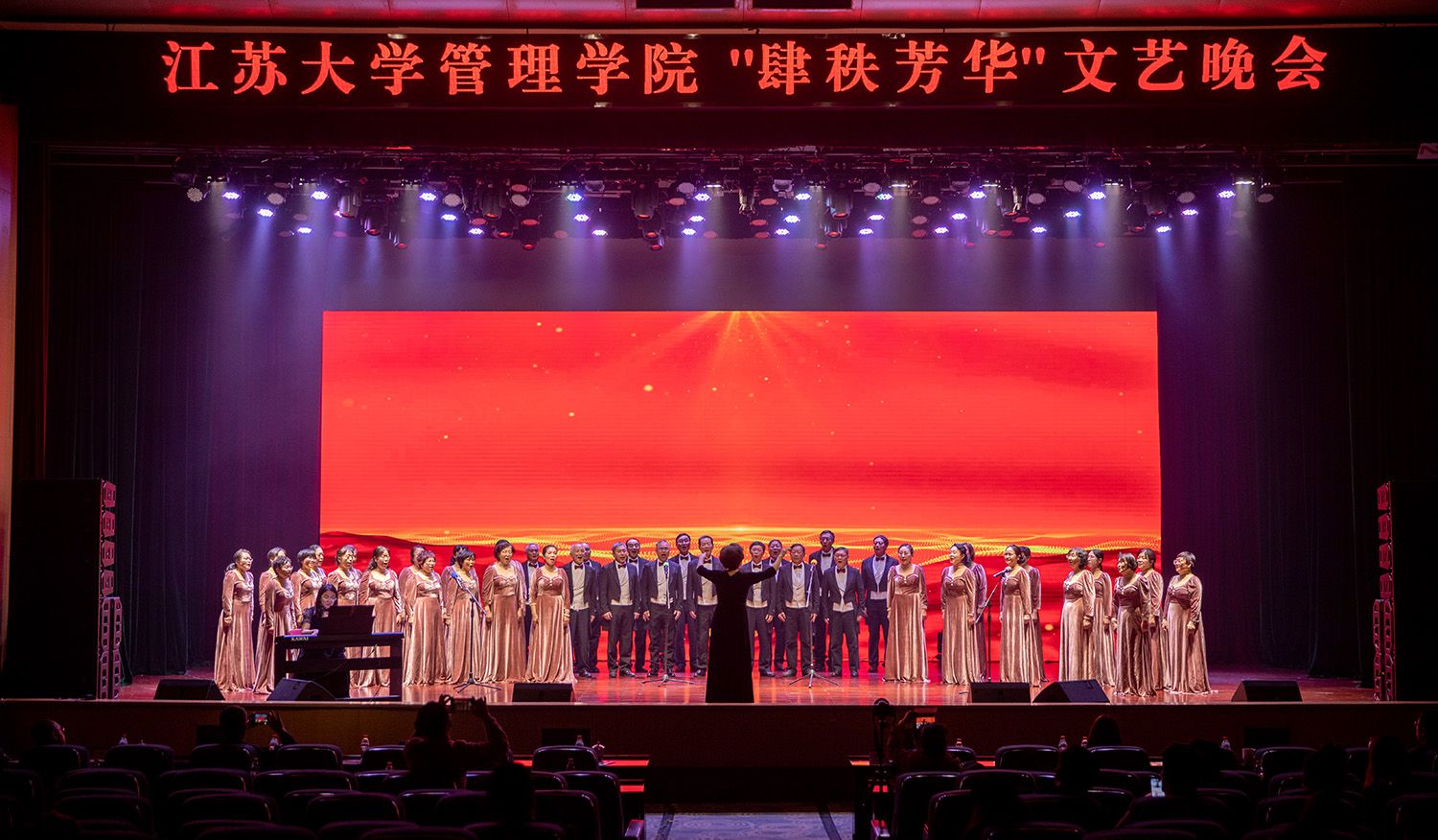 当晚,“肆秩芳华”文艺晚会在小礼堂上演,师生们用歌舞、小品、走秀等文艺节目,庆祝管理学院办学40周年。(管理学院)
