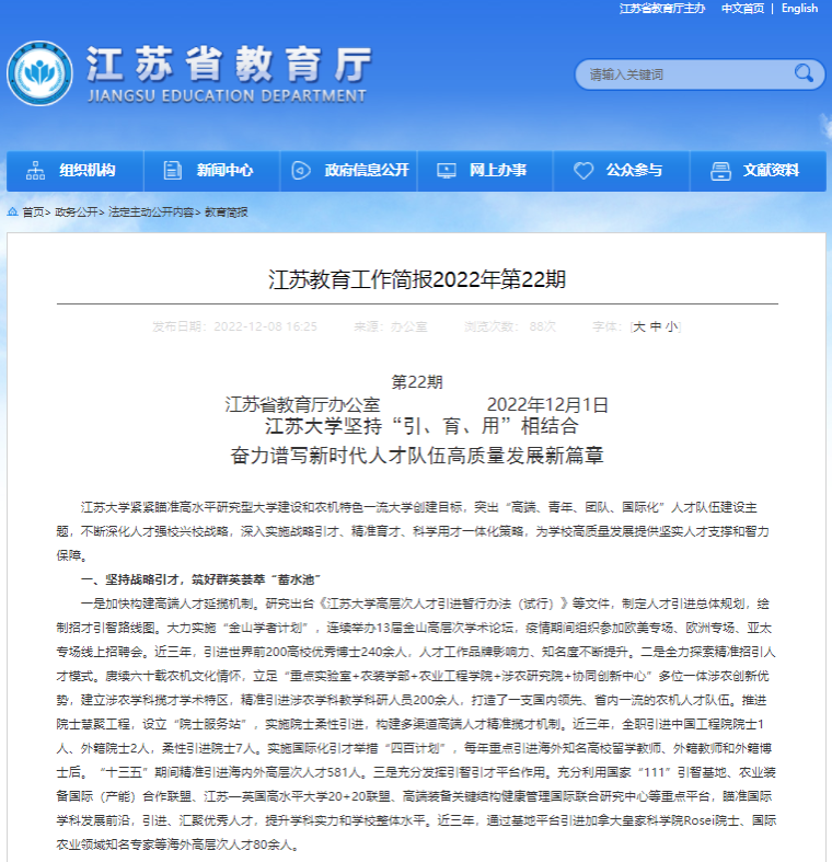 12月8日,江苏省教育厅《江苏教育工作简报》(2022年第22期)以《sunbet申搏官方网站坚持“引、育、用”相结合 奋力谱写新时代人才队伍高质量发展新篇章》为题,从坚持战略引才,筑好群英荟萃“蓄水池”;坚持精准育才,厚植全面成长“好沃土”;坚持科学用才,彰显才尽其用“大作为”三个方面,专题报道了sunbet申搏人才工作的思路、举措与成效。