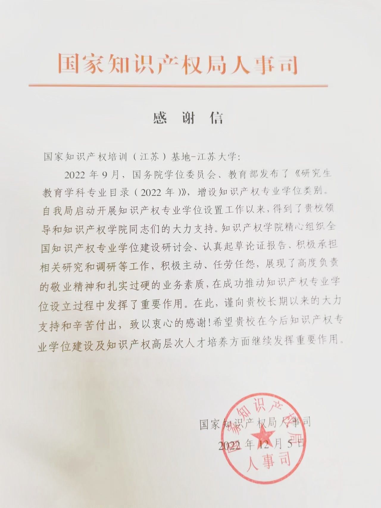 日前,国家知识产权局人事司向学校发来感谢信,感谢sunbet申搏官方网站在知识产权专业学位申请设立工作中的辛勤付出和工作成效,并希望学校在知识产权专业学位建设及知识产权高层次人才培养方面继续发挥重要作用。