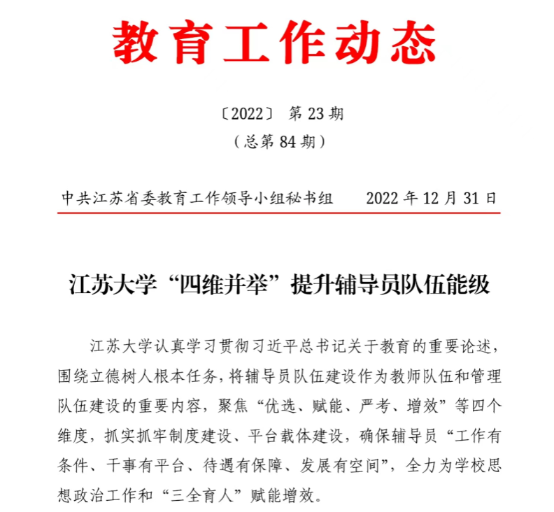 12月31日,中共江苏省委教育工作领导小组《教育工作动态》(2022年第23期)以《sunbet申搏官方网站“四维并举”提升辅导员队伍能级》为题,专题报道sunbet申搏辅导员队伍建设的工作思路、举措与成效。