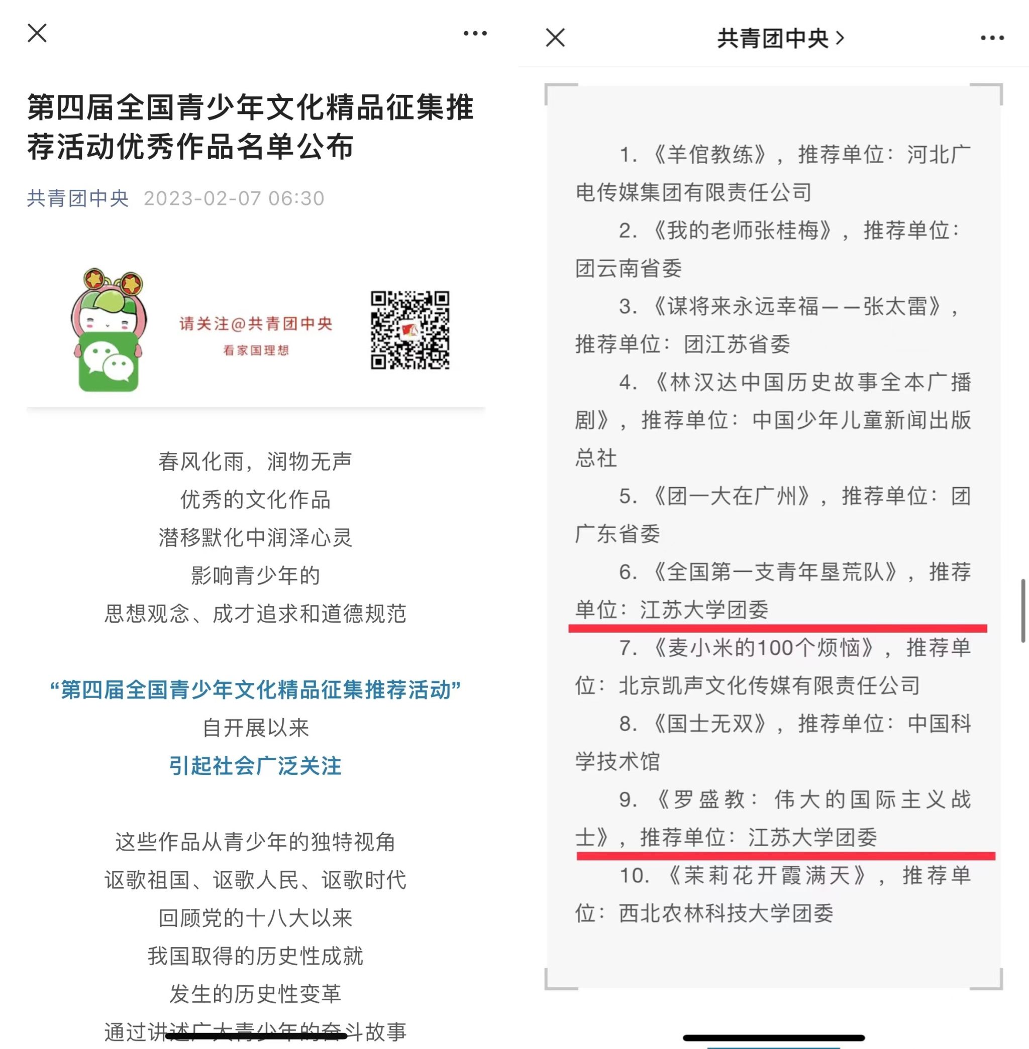 第四届全国青少年文化精品征集推荐活动由团中央宣传部组织开展,自启动以来,引起广泛关注,共评选出优秀作品70项。sunbet申搏创作的广播剧《全国第一支青年垦荒队》和《罗盛教:伟大的国际主义战士》,结合迎接学习宣传贯彻党的二十大、庆祝建团100周年主题,再现了罗盛教光辉的一生和第一支青年垦荒队的青春故事,被“共青团中央”“学校共青团”官微专门发布(单条阅读量10W+),并获第二届江苏省大学生网络文化节优秀作品(音频类)一等奖,社会反响良好,有效提升了学校“网上共青团”育人实效。
