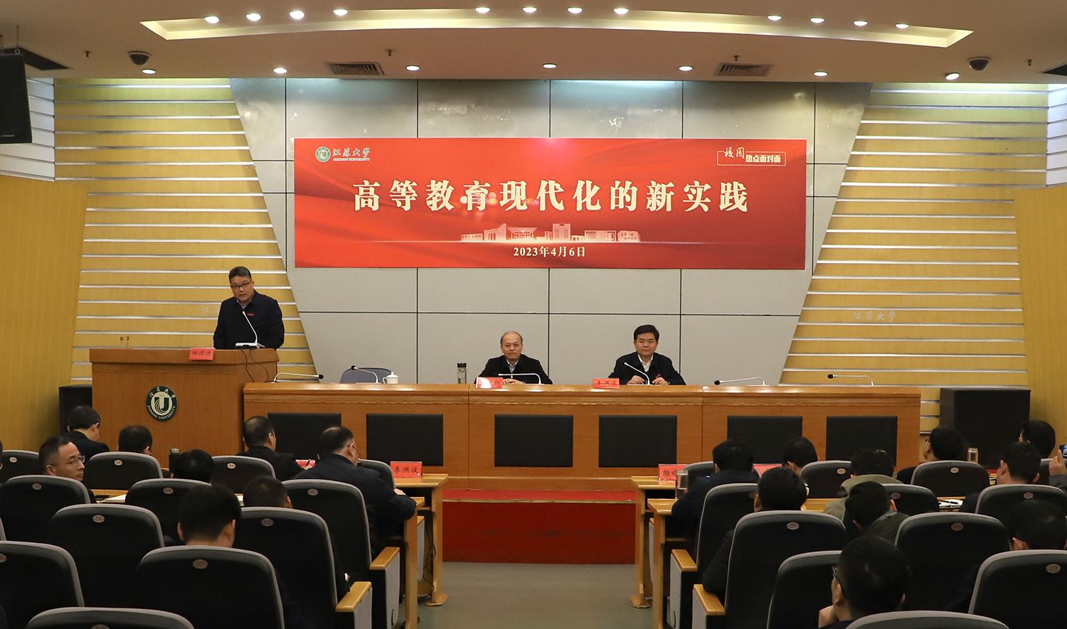 4月6日,校长颜晓红、校党委副书记李洪波走进校园热点面对面之“高等教育现代化的新实践”活动现场,与老师们面对面交流,围绕如何夯实大学的归依,探索行业特色地方高校的高等教育现代化特色发展之路,在中国科教体系中传递江大模式、江大方案进行现场释疑解惑。校党委常委、宣传部部长杨道建主持活动。