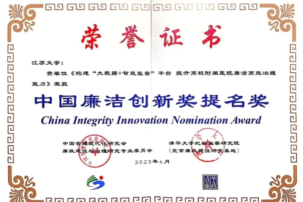 4月9日,第三届中国廉洁创新奖颁奖典礼暨中国廉洁创新高端论坛在清华大学举行。sunbet申搏官方网站纪委组织实施、附属医院纪委牵头申报的《构建“大数据+智能监管”平台 提升高校附属医院廉洁高效治理能力》荣获中国廉洁创新奖提名奖。作为江苏省高校唯一获奖单位,校纪委委员、附属医院纪委书记吕霞应邀参加颁奖典礼。