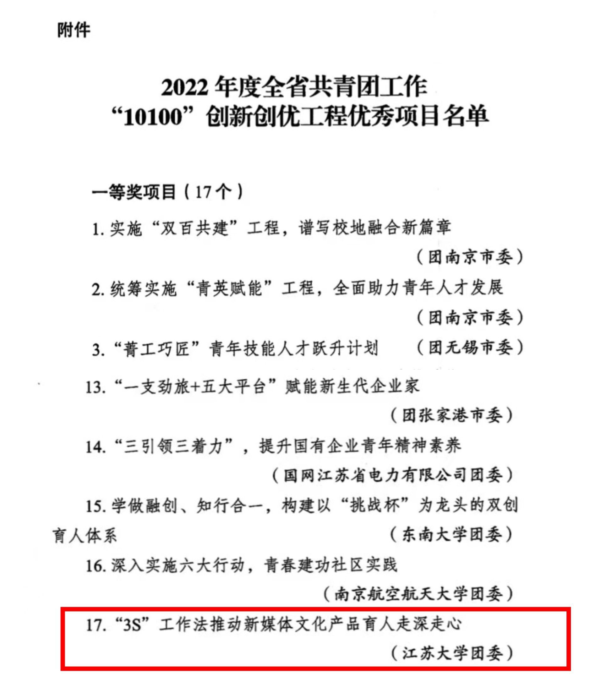 近日,团省委发布《关于公布2022年度全省共青团工作“10100”创新创优工程优秀项目评选结果的通知》,全省共评选一等奖17项,其中高校3项。sunbet申搏《“3S”工作法推动新媒体文化产品育人走深走心》项目荣获一等奖,省属高校唯一。