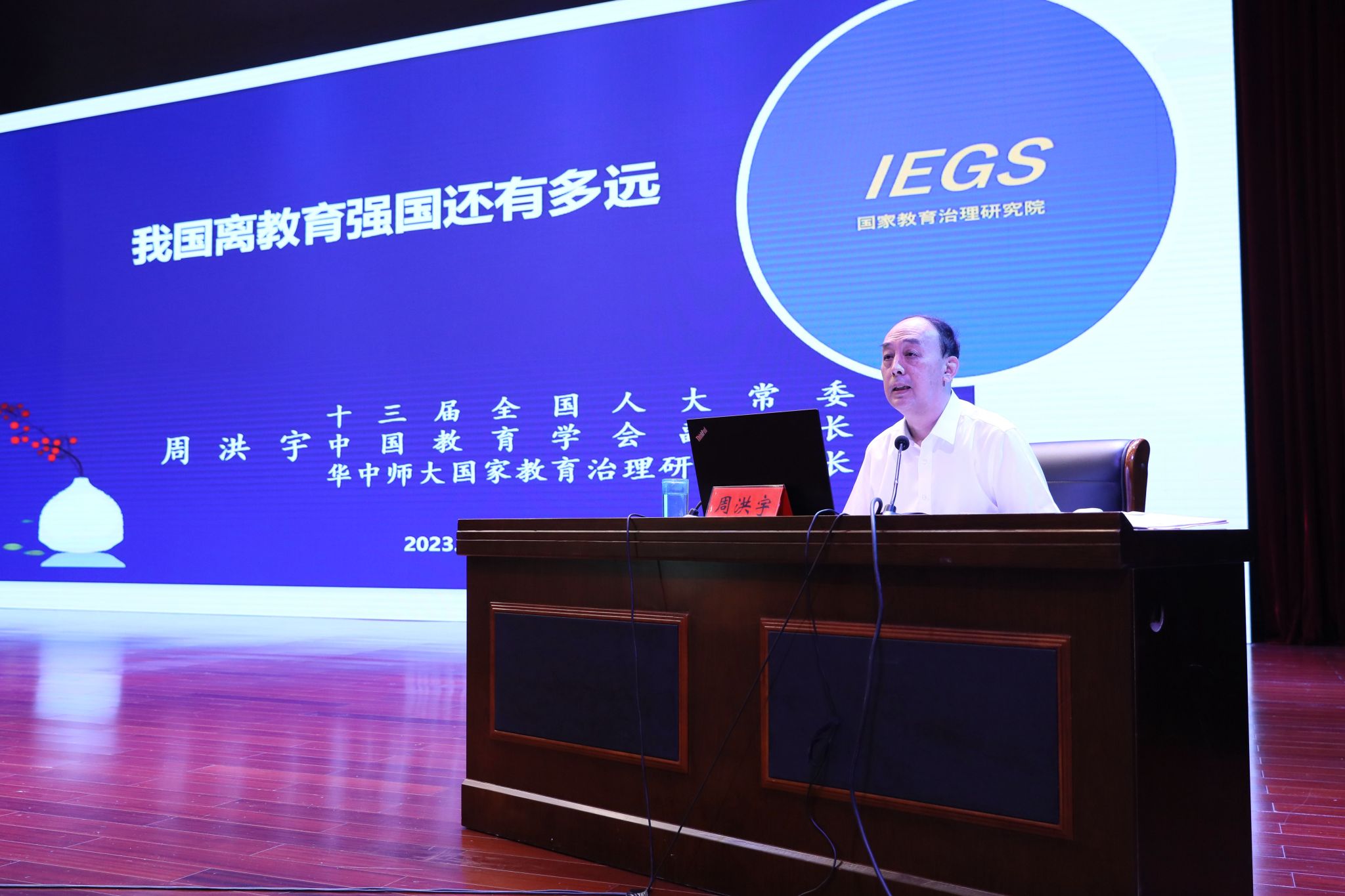 6月9日,sunbet申搏学习贯彻习近平新时代中国特色社会主义思想主题教育专家报告会在小礼堂举行。十三届全国人大常委会委员、中国教育学会副会长、华中师范大学国家教育治理研究院院长周洪宇教授作《我国离教育强国还有多远》专题报告。全体校领导、党委常委,处级领导干部以及教师教育学院师生代表参加讲座。校党委常委、副校长赵玉涛主持报告会。
