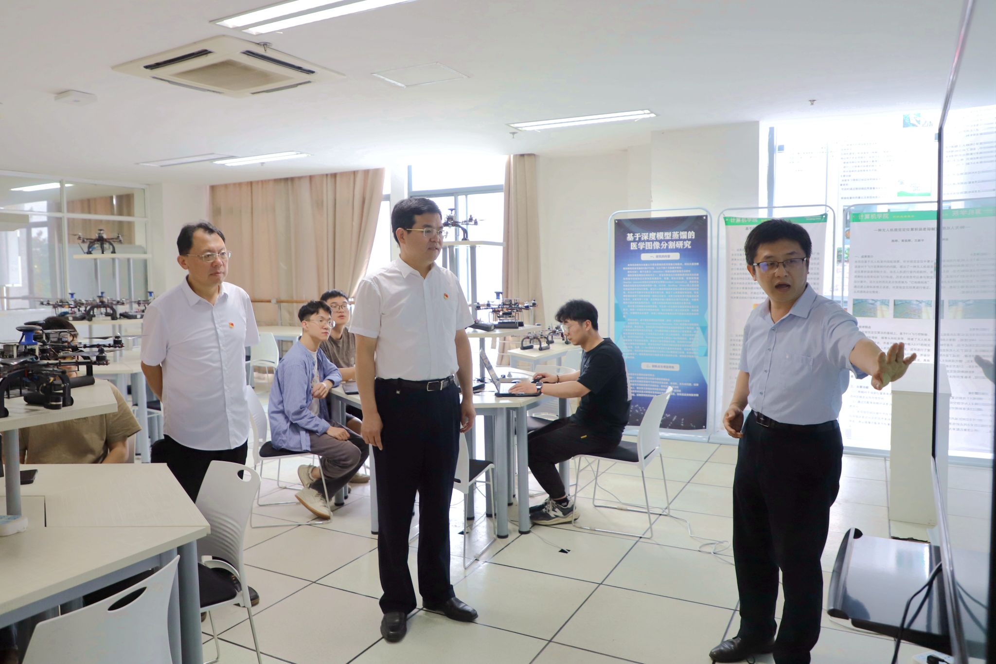 在计算机学院,李洪波实地参观了涉农成果演示实验室和信创中心实验室,学院党委书记孙国、院长毛启容汇报了学院的工作举措、成效及面临的困难。李洪波勉励大家充分发挥信息学科专业优势,聚焦国家重大战略需求,勇于开拓创新,为乡村振兴贡献力量。李洪波强调,要高度重视学习贯彻习近平新时代中国特色社会主义思想主题教育,在学习中找到解决问题的方法;要切实抓好党建工作,以高质量党建引领事业高质量发展;要认真研究人才需求状况,以差异化方式解决人才短缺的问题。