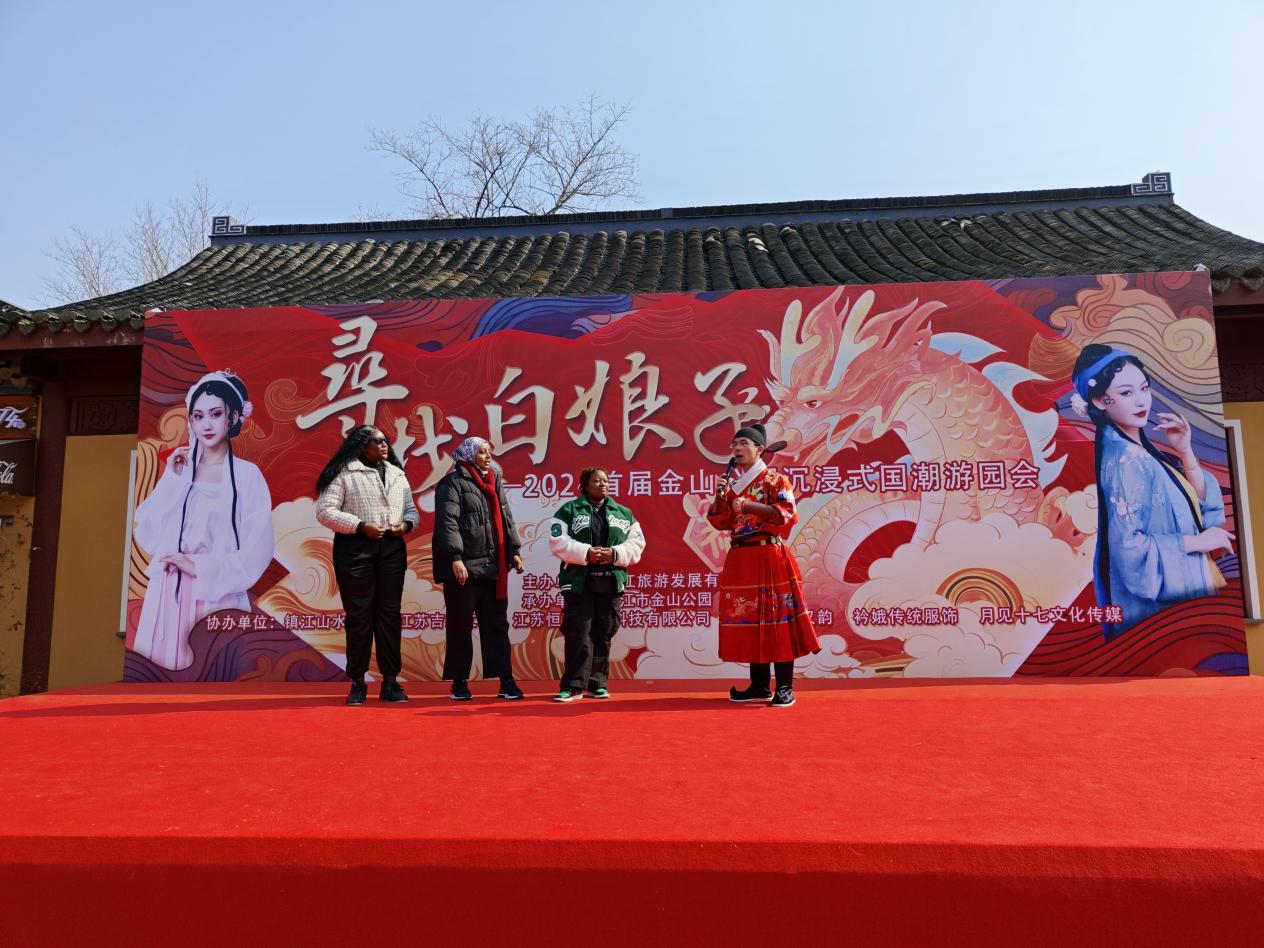 在金山公园大草坪主舞台,舞台剧、宋代点茶展演、汉服秀展等精彩上演。“保和堂许仙白娘子义救乡民”、“王昌龄芙蓉楼送辛渐”、“梁红玉击鼓战金山”、“苏东坡登妙高台”这4个经过精心演绎的神话、历史故事组成了一场金山主题舞台情景剧……“在金山1600多年的历史长河中,涌现名人无数,梁红玉、苏轼……他们见证了这座千年古刹的烟火与繁盛,也演绎了属于自己的精彩故事。我们想用这样的方式为远道而来的每一位游客,讲述金山的故事,留下关于金山景区的独家记忆。”汉服演员王佳琪说。“金山公园我们之前来过,白娘子和许仙的故事之前就听说过,今天看了表演,非常精彩,让我留下了很深刻的印象。”法提娅和朋友们饶有兴致地观看,并用手机记录下这精彩的一幕。