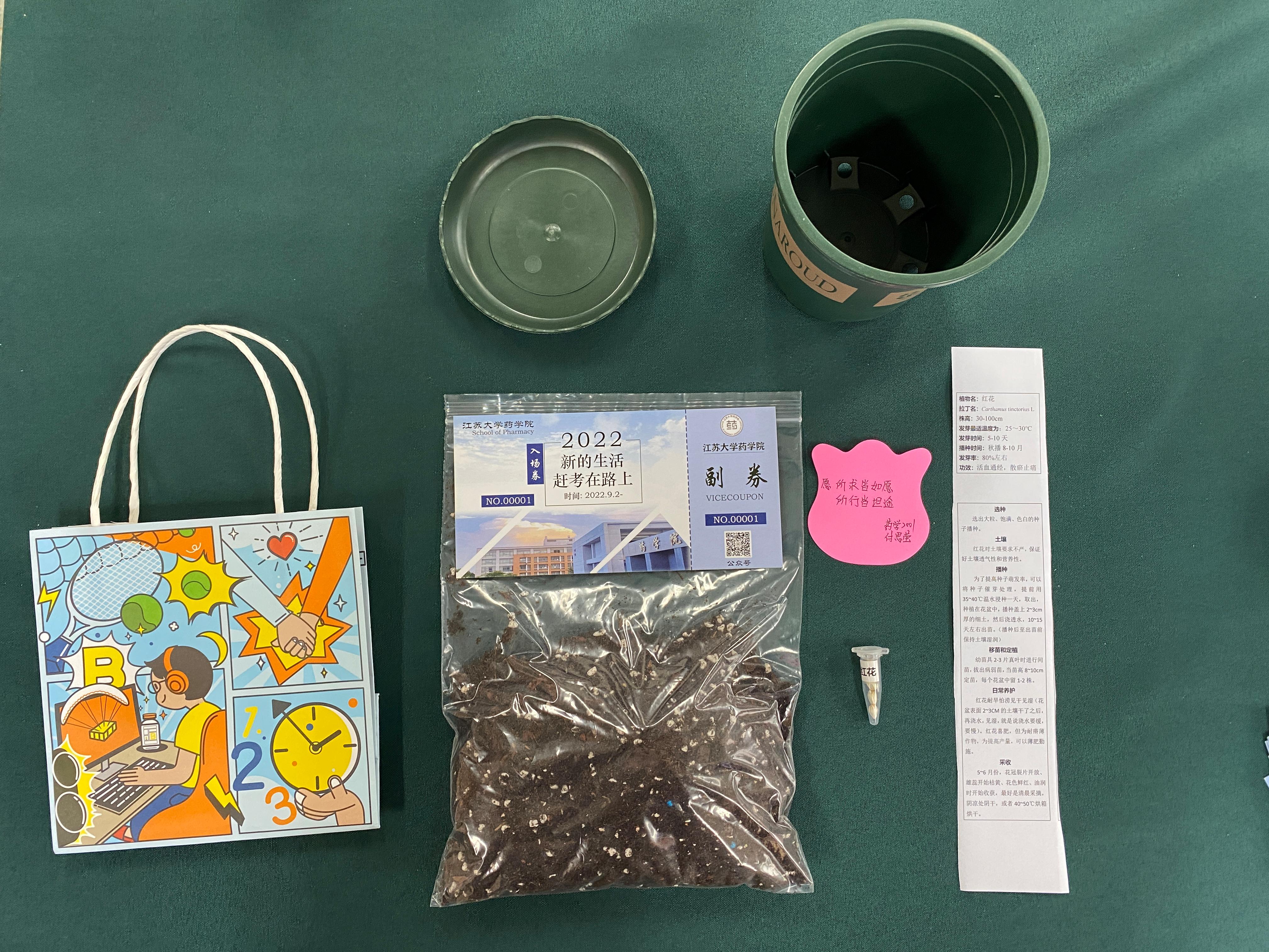 “顺利的话,学生们在11月份便能看到红花开花。”药学院辅导员王莲说,在中药学与药学系专业教师傅海珍的指导下,学院选择了适宜秋播、半月可出芽、一年可收的我国传统中药材红花。为了尽可能帮助每位新生成功栽种,学院做好了选种工作。