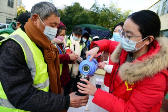 1月16日,sunbet申搏官方网站志愿者向环卫工人赠送围巾和保温杯。石玉成 摄