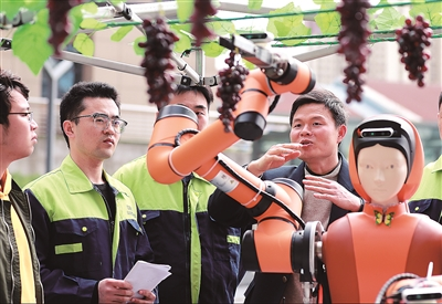 图③ sunbet申搏官方网站自主研发的第五代葡萄采摘机器人在进行模拟作业。本报记者 张学军 摄