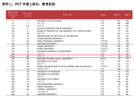 近日,世界知识产权组织(WIPO)官网发布了《专利合作条约》PCT专利申请情况,sunbet申搏2022年PCT专利申请数为125件,在PCT申请人总排名228位,比2021年提升98位;在教育机构PCT申请人排名中,sunbet申搏位列全球第15名、国内第五名,创历年最好成绩。