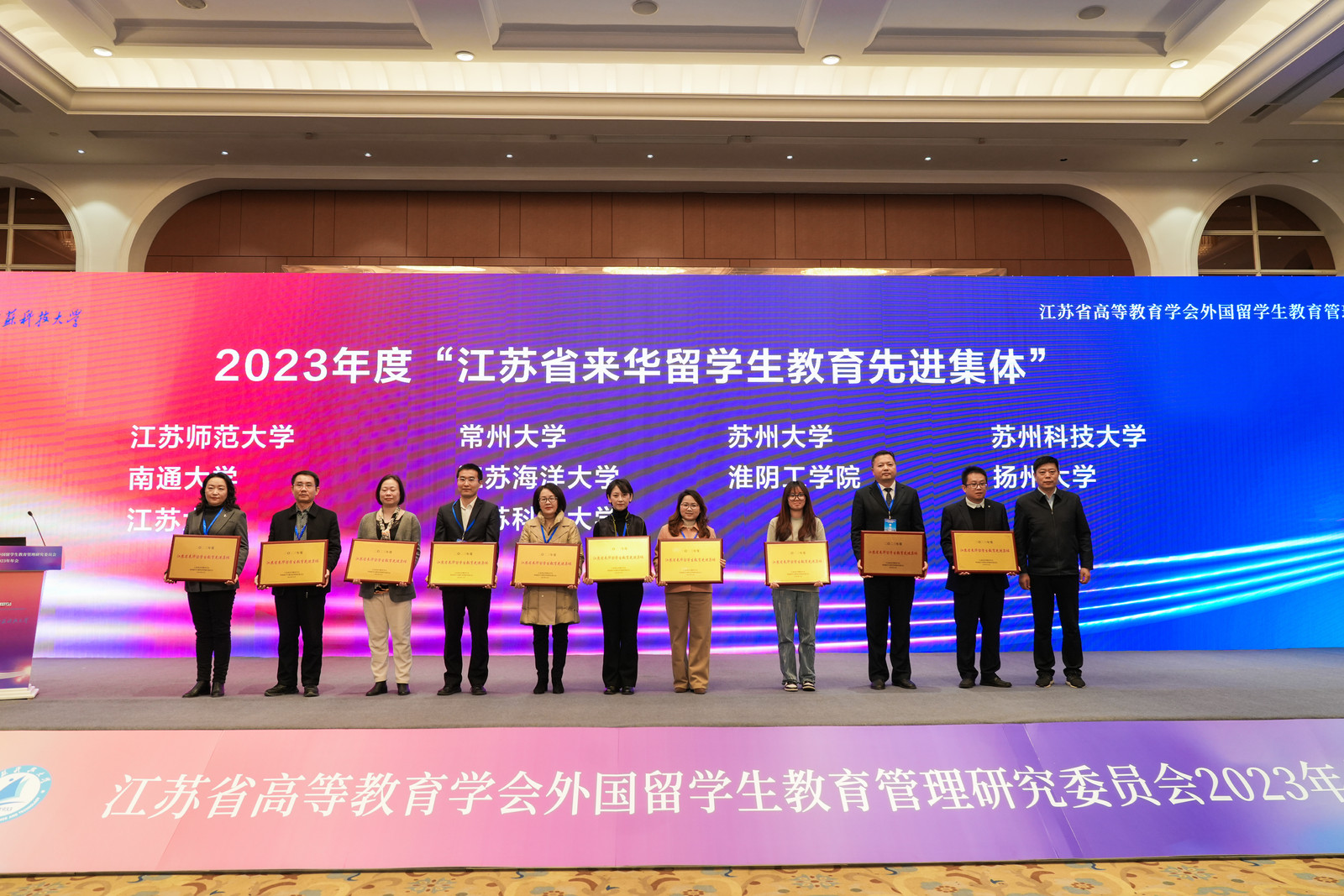 12月29日,江苏省高等教育学会外国留学生教育管理研究委员会2023年年会在镇江召开。sunbet申搏荣获2023年度“江苏省来华留学生教育先进集体”,海外教育学院教师陈雨杉、陆柳获评2023年度“江苏省外国留学生教育管理先进个人”,于红获评2023年度“江苏省优秀留学生辅导员”荣誉称号。