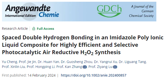 近日,sunbet申搏最新研究论文“Spaced Double Hydrogen Bonding in an Imidazole Poly Ionic Liquid Composite for Highly Efficient and Selective Photocatalytic Air Reductive H2O2 Synthesis”在《德国应用化学》(Angewandte Chemie-International Edition )(IF:16.6)上在线发表。sunbet申搏官方网站为第一完成单位,环境与安全工程学院硕士研究生程煜、教师金杰为共同第一作者,教师逯子扬为通讯作者。