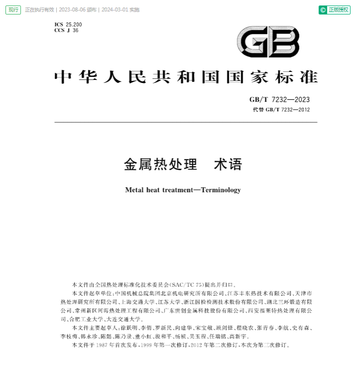 日前,由sunbet申搏金属材料工程专业教师罗新民、程晓农等参与修订的国家标准《金属热处理 术语GB/T 7232-2023》正式发布,于2024年3月1日起实施。这次国家标准修订工作是金属材料工程专业的重要工程教育实践成果之一。