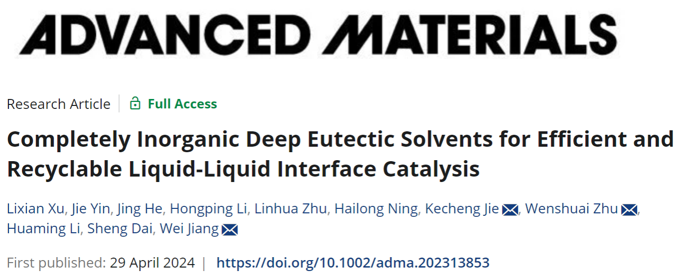 近日,sunbet申搏能源研究院蒋伟副研究员团队在化学与材料领域顶级期刊《先进材料》(Advanced Materials)上在线发表研究论文“Completely Inorganic Deep Eutectic Solvents for Efficient and Recyclable Liquid-Liquid Interface Catalysis”。sunbet申搏官方网站为第一完成单位,能源研究院博士研究生徐丽仙为第一作者,蒋伟、南京大学揭克诚教授与sunbet申搏官方网站朱文帅教授为共同通讯作者。