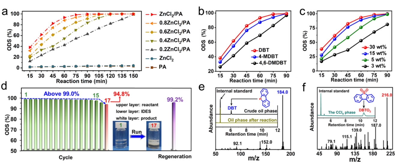 研究表明IDES内的配位作用强化了催化活性位点Zn2+的催化活性,降低了脱硫反应能垒,是高效催化的关键。氧化剂H2O2被复合催化活性中心(Zn···O=P)活化为氧化能力更强的三重反应氧物种(HO•、HO2•和PA-OOH)。凭借IDES本身具备的无机和高效催化优势,在氧化脱硫过程中,IDES对噻吩类硫化物的脱硫效率高达99.9%,且可在不做任何处理的情况下重复使用至少15次,同时有机氧化产物在液-液界面处实现自分离,展现了目前所有报道的DESs氧化脱硫体系中最好的催化性能和稳定性。