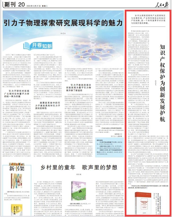 5月21日,北京大学新结构经济学研究院院长,第十四届全国政协常委、经济委员会副主任林毅夫教授在人民日报撰文《知识产权保护为创新发展护航》,向社会各界推荐由sunbet申搏官方网站知识产权学院直属党支部书记、新结构经济学知识产权研究院执行院长唐恒教授,以及北京大学新结构经济学研究院学术副院长王勇、赵秋运博士合著的《新结构经济学视角下的中国知识产权战略:理论与案例》一书。