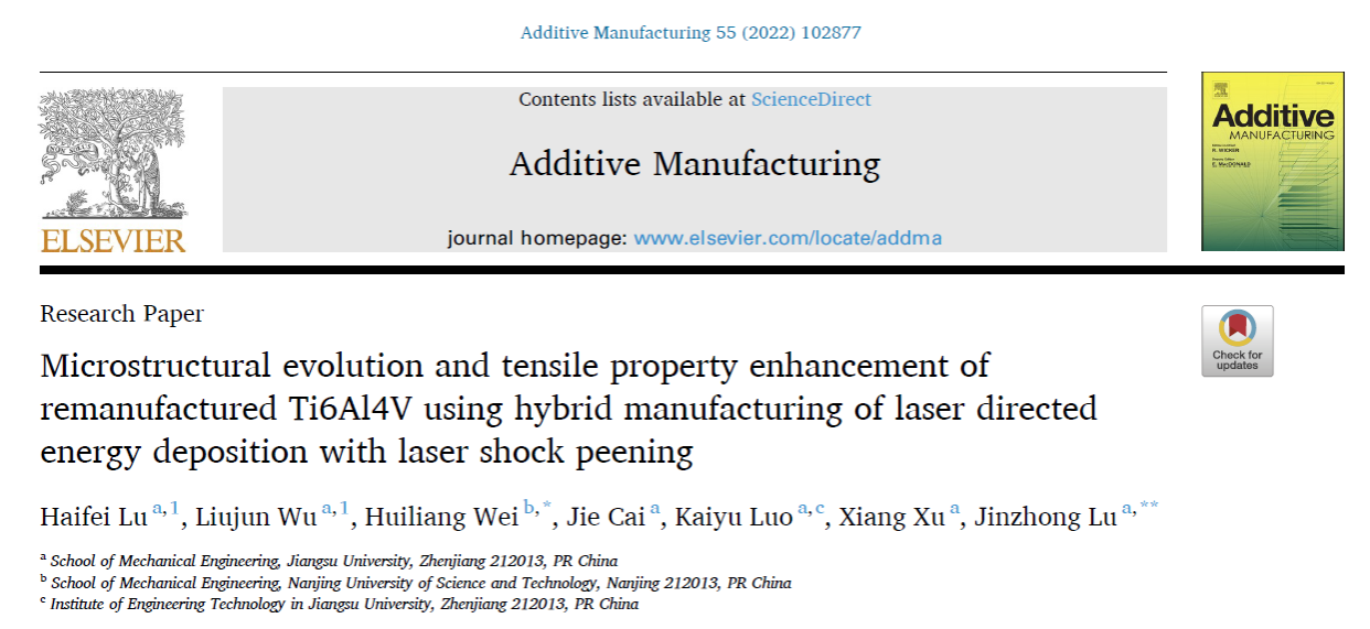 近日,经初评推荐、资格审查、专业评审、综合评审等程序,机械工程学院鲁金忠教授团队发表在《Additive Manufacturing》上的SCI高被引论文“Microstructural evolution and tensile property enhancement of remanufactured Ti6Al4V using hybrid manufacturing of laser directed energy deposition with laser shock peening(激光热力交互沉积再制造Ti6Al4V合金微观组织演变和拉伸性能强化)”入选2024年江苏省自然科学百篇优秀学术成果论文推选(sunbet申搏官方网站唯一入选)。青年教师卢海飞副教授为第一作者,鲁金忠和南京理工大学韦辉亮教授为共同通讯作者。该工作得到国家自然科学基金(51775250)等资助。